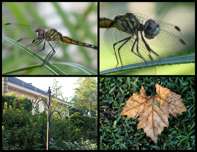 The leaf photo is for Haley...Every time I see one I have to take a picture. This dragonfly was flying around my front door then landed on my palm tree. He let me get close enough to take a picture. I was very surprised. Pretty amazing creature up close.